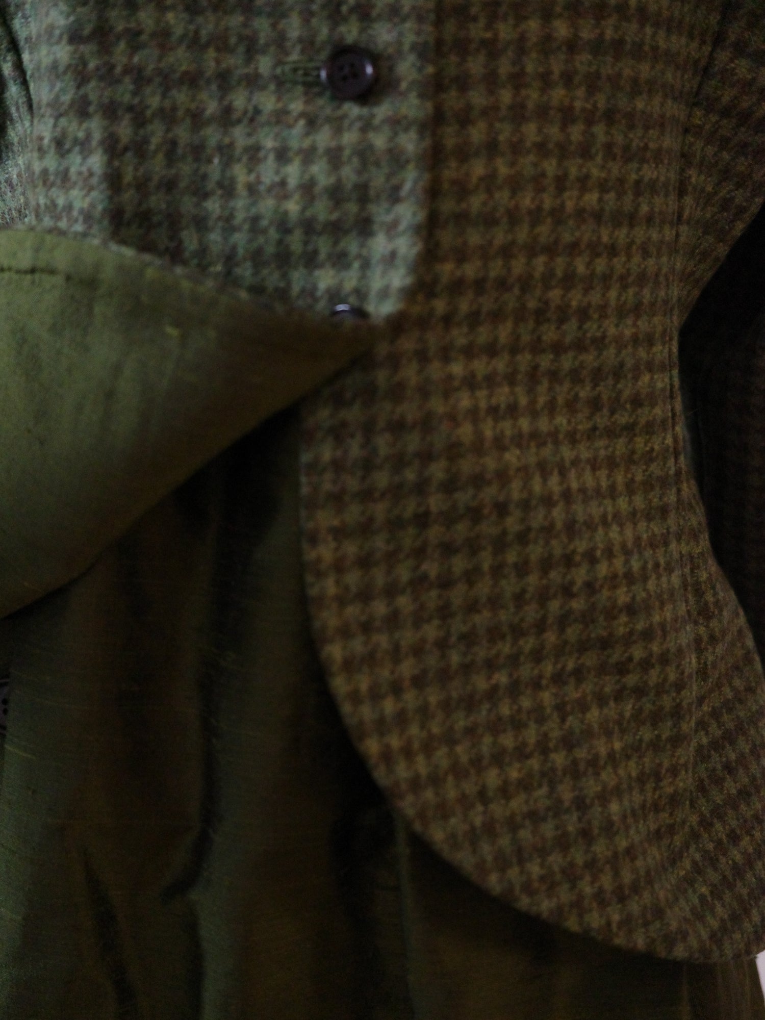 Chaqueta verde de lana inglesa pata de gallo forrada de seda dupioni verde.