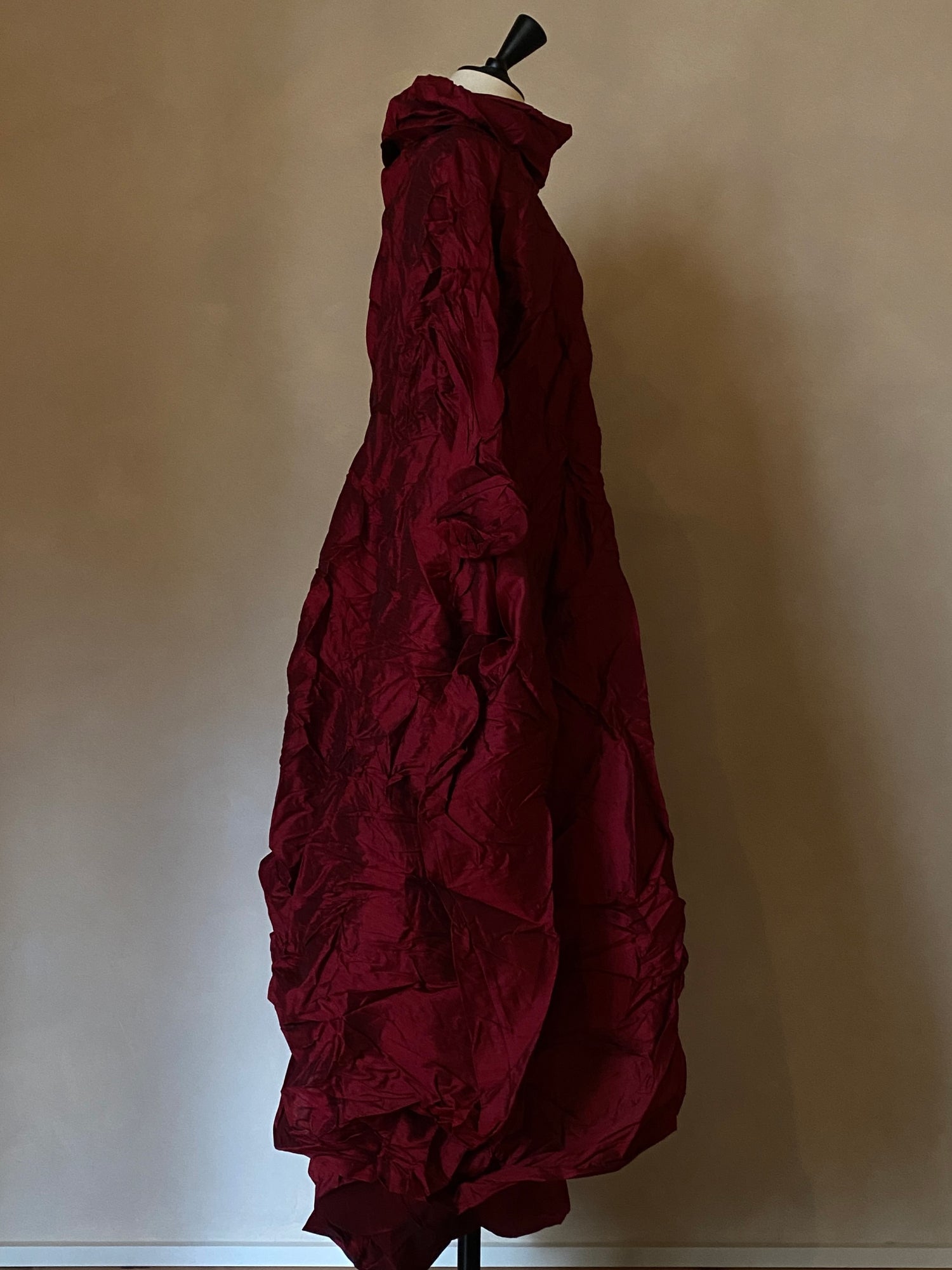 Voluminous burgundy dupioni silk dress with a chimney collar.