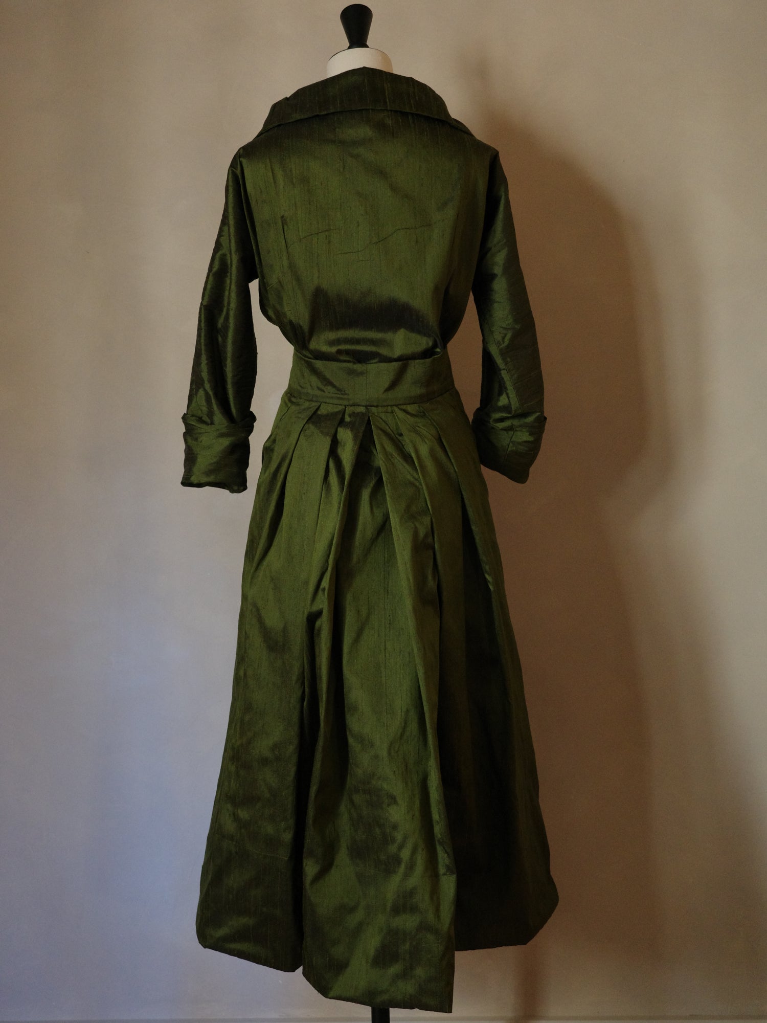 Green dupioni silk skirt lined with Liberty London floral fabric. It features adjustable waist buttons.
